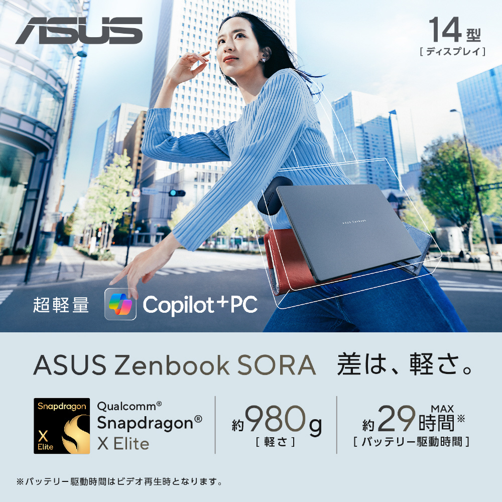 マックス45TOPSのNPUを搭載したSnapdradon XシリーズCPUにより、毎秒数兆回にも及ぶ高速AI 処理が可能に。昨今増えているオンデバイスのAI関連タスクも、すばやくシームレスにこなせます。また、抜群の消費電力効率で、長時間駆動と高いパフォーマンスを両立。今までにないPC体験を、ASUS Zenbook SORAで。