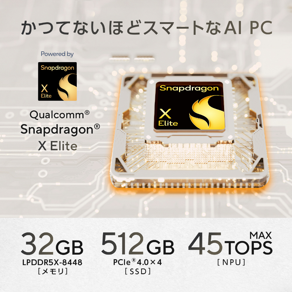 | NPU(AIプロセッサ) | AI機能:Qualcomm Hexagon NPU 45TOPS (Qualcomm AI エンジン 最大計75TOPS) |