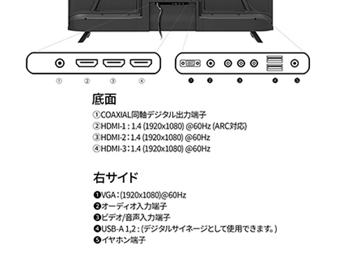 ■インターフェイスはHDMI1.4 x1 (60Hz/ARC)、HDMI1.4 x2 (60Hz)を搭載。パソコンのみならず、ブルーレイディスクプレーヤー、家庭用ゲーム機、デジタルビデオカメラなどを1本のケーブルで接続できます。 さらに、USBポートを搭載していますので、デジタルサイネージとしてもご利用できます(屋内使用のみ)。パソコンなどがなくても、USBメモリーを差すだけで、簡単に画像や動画を表示できます。※コンテンツの再生にはリモコンでの操作が必要です。自動再生機能には対応しておりません。