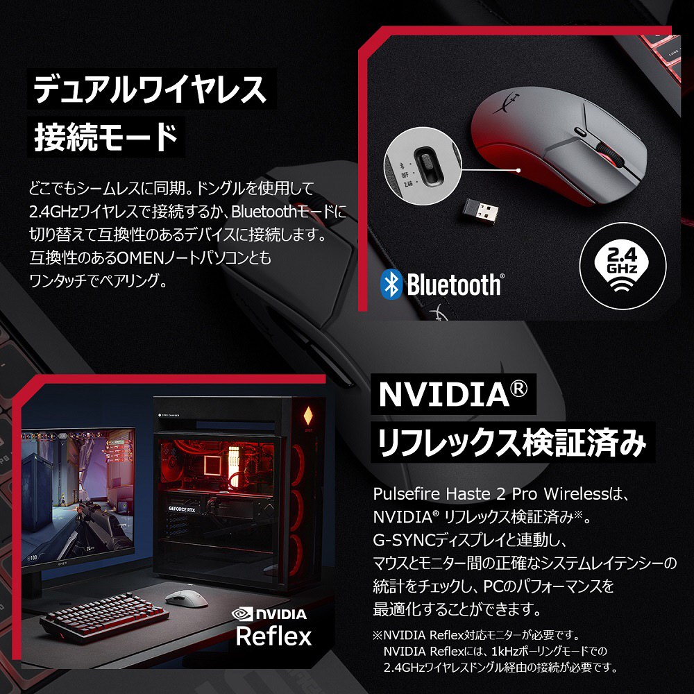 ※NVIDIA Reflex対応モニターが必要です。NVIDIA Reflexには、1kHz ポーリングモードでの2.4GHzワイヤレスドングル経由の接続が必要です。