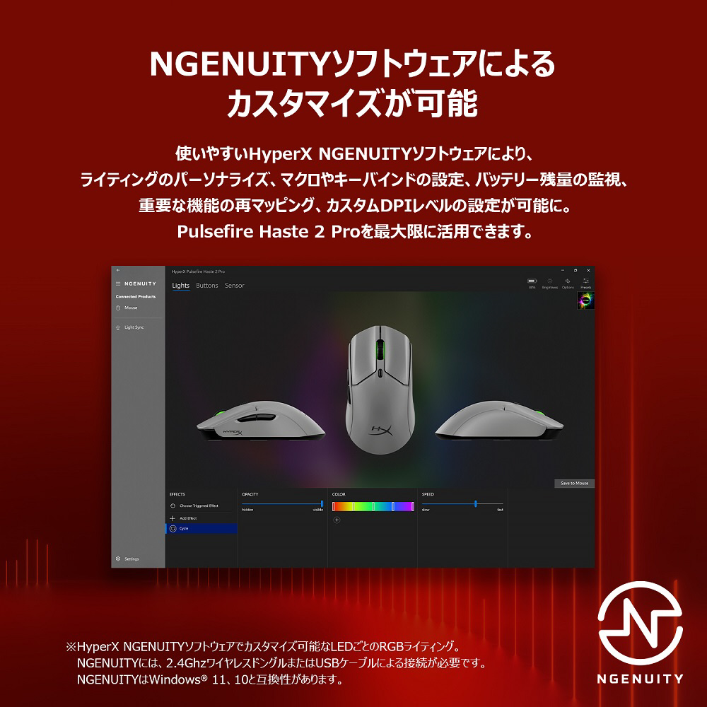 Hasteの製品名にふさわしく、Pulsefire Haste 2 Proは61グラムの軽量構造を採用しているため、長時間ゲームをしても、重い周辺機器による疲れや動きの抵抗を感じることがありません。長時間のゲーミングセッションをする場合、Pulsefire Haste 2 Proは1回の充電で最大90時間のゲームが可能です。HyperX NGENUITYソフトウェアにより、バッテリー駆動時間のモニタリング、重要な機能の再マッピング、カスタムDPIレベルの設定も可能です。