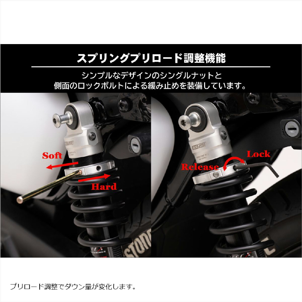 備考:プリロード調整することによりダウン量は変化します。 ※車高が下がる為、ノーマル車両に比べセンタースタンドの引き起こしが重くなります。