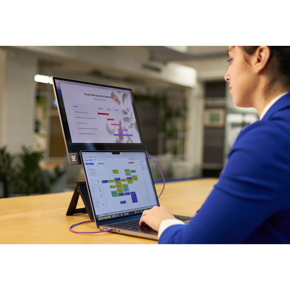 USB-Cケーブル1本でノートPC等と簡単に接続可能で、付属のスタンドは高さの調節範囲が広く、作業環境に応じて理想的な位置に設定できます。移動先でも効率的かつ快適な作業環境を求めるユーザーに最適な選択肢です。