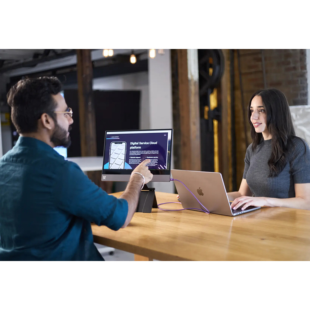 持ち運びやすさと高い堅牢性を兼ね備えた超薄型ポータブルディスプレイです。付属のスタンドは高さの調節範囲が広く、作業環境に応じて快適な位置に設定できます。