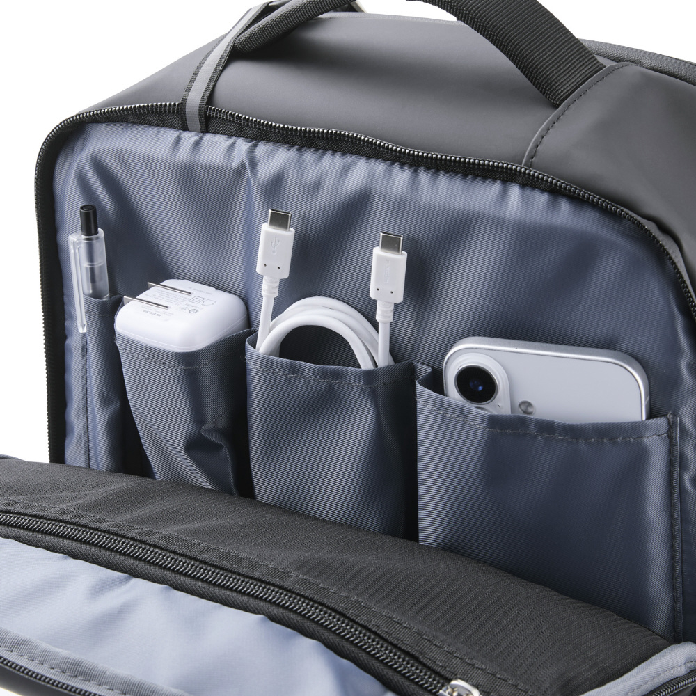 前面ポケット内には、充電器などの小物を入れるのに便利な仕切りポケットが付いています。