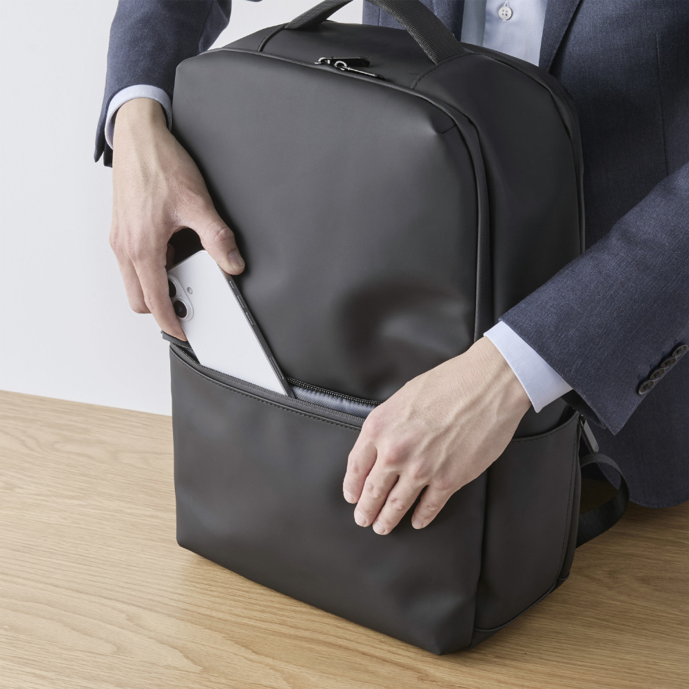 必要なときにすぐ取り出せる!大小さまざまなポケットを備えたスクエアバックパックです。決まった場所に収納することで、かばんの中がごちゃつかず、必要なものをすぐに見つけられます。