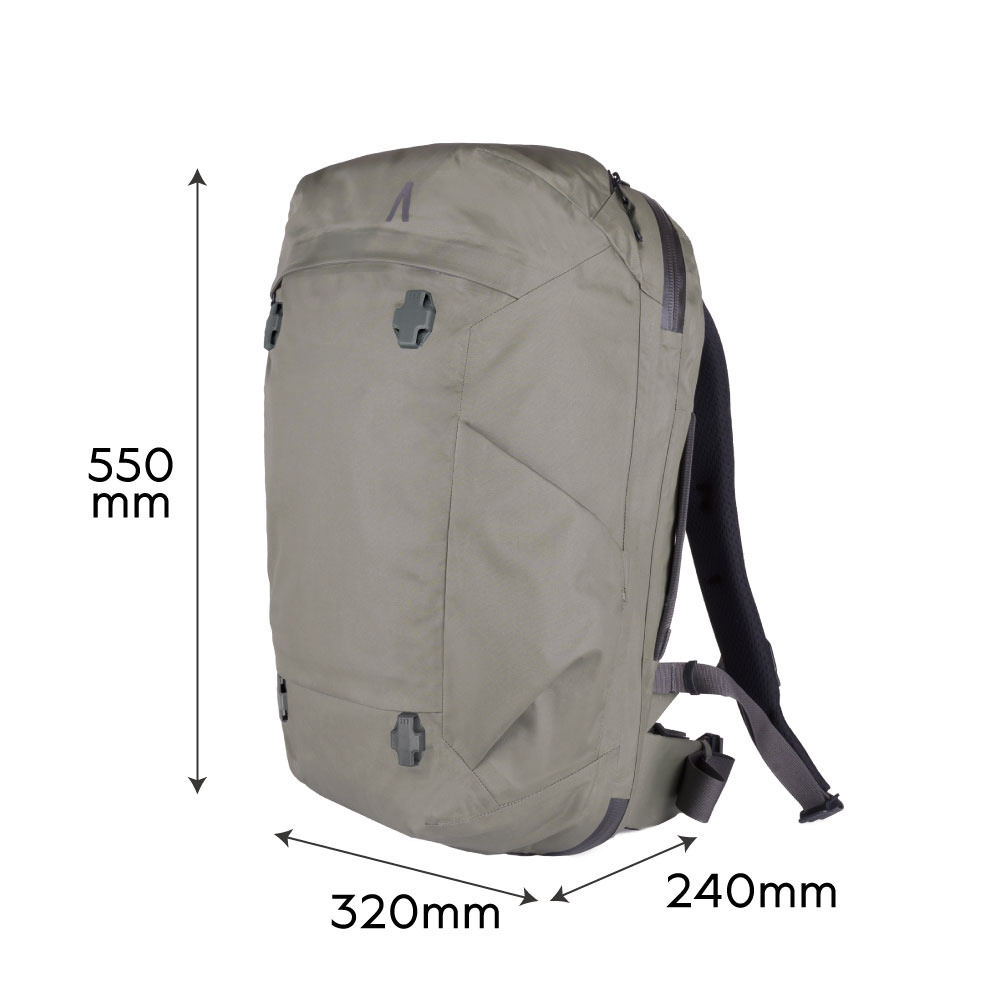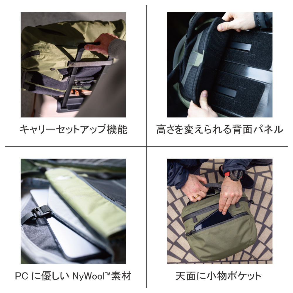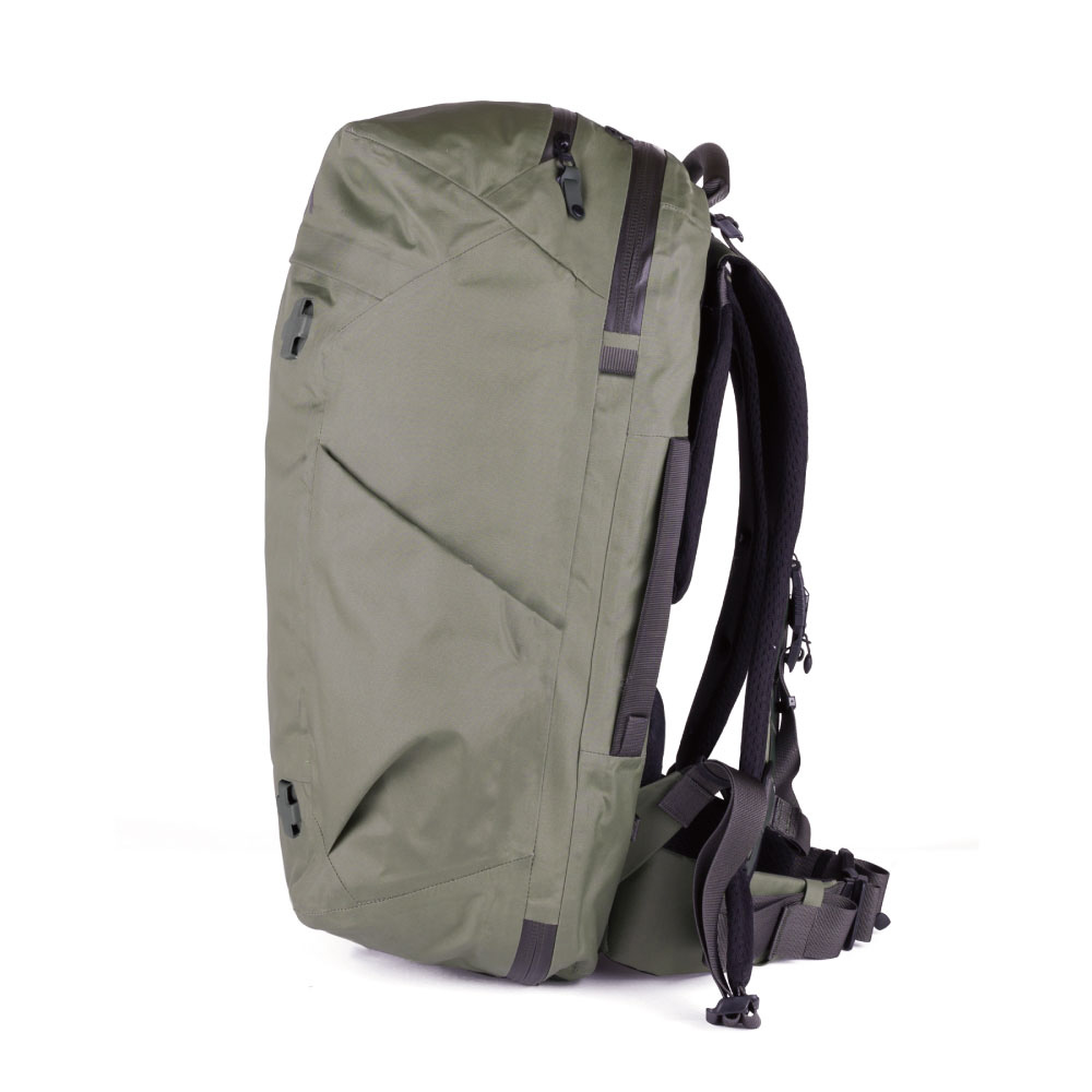 ランドリーバッグが付属した、横開きのバックパック。35Lの大容量と自由度の高いカスタム性があり、旅行やアウトドア活動にぴったりです。撥水加工+止水ジッパーを採用し、防水性もばっちりです。