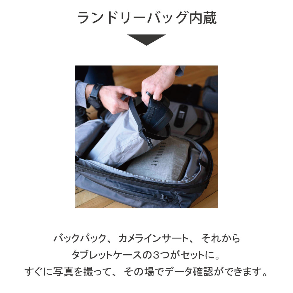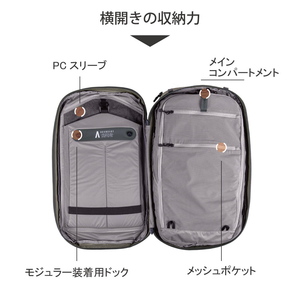Boundary Supplyのカメラインサートを装着することができます。左側にはメインコンパートメントにアクセスできるサイドジップを用意しています。