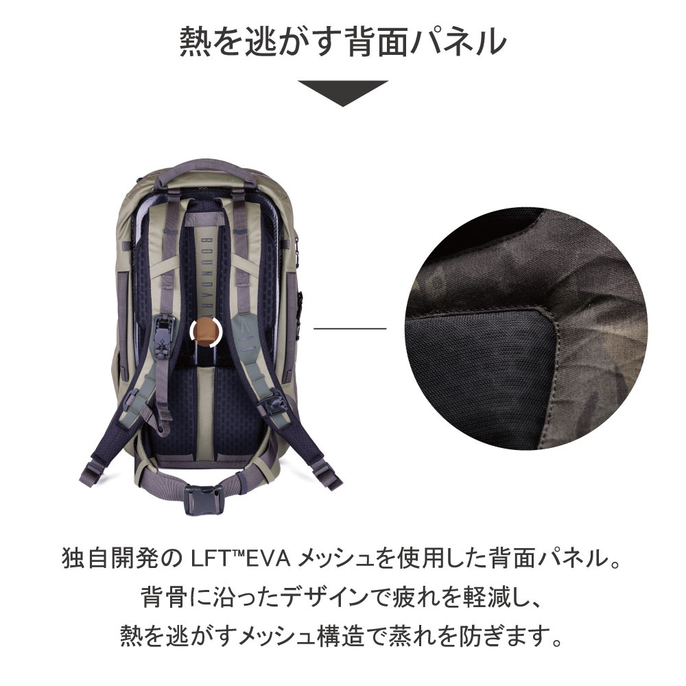 背面素材は熱をこもらせず疲れを溜めさせないLFT?EVAメッシュを使用。ベルクロで高さを調節できるので、体格に合わせた調節が可能です。