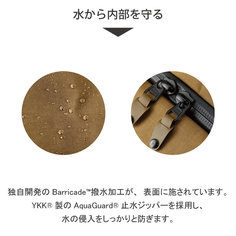表面にはBarricade 撥水加工を施し、ジッパーにはYKK(R)AquaGuard(R)止水ジッパーを採用しました。