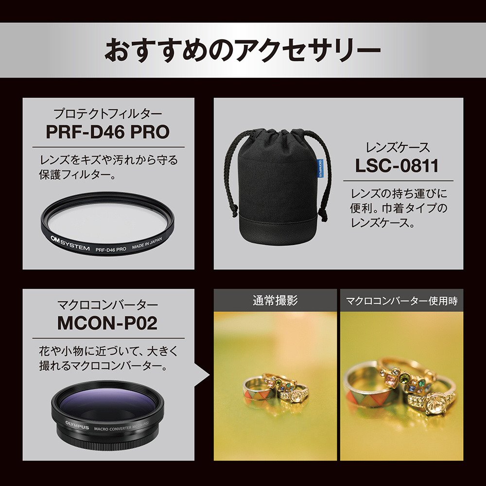 さらに大口径 F1.8の美しい背景ボケを活かした写真や暗い室内での手持ち撮影も楽しめます。また、AF(オートフォーカス)の高速化かつ静音化を実現した“MSC(Movie & Still Compatible)機構”と、OM SYSTEMボディーが持つ高性能手ぶれ補正機構により、静止画のみならず動画も快適に撮影いただけます。