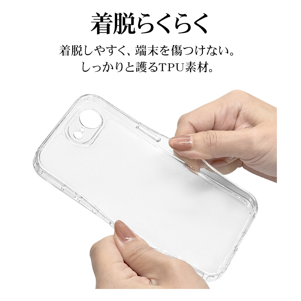側面は弾力と柔軟性を兼ね備えたTPU素材で端末を衝撃から保護し、着脱も簡単です。