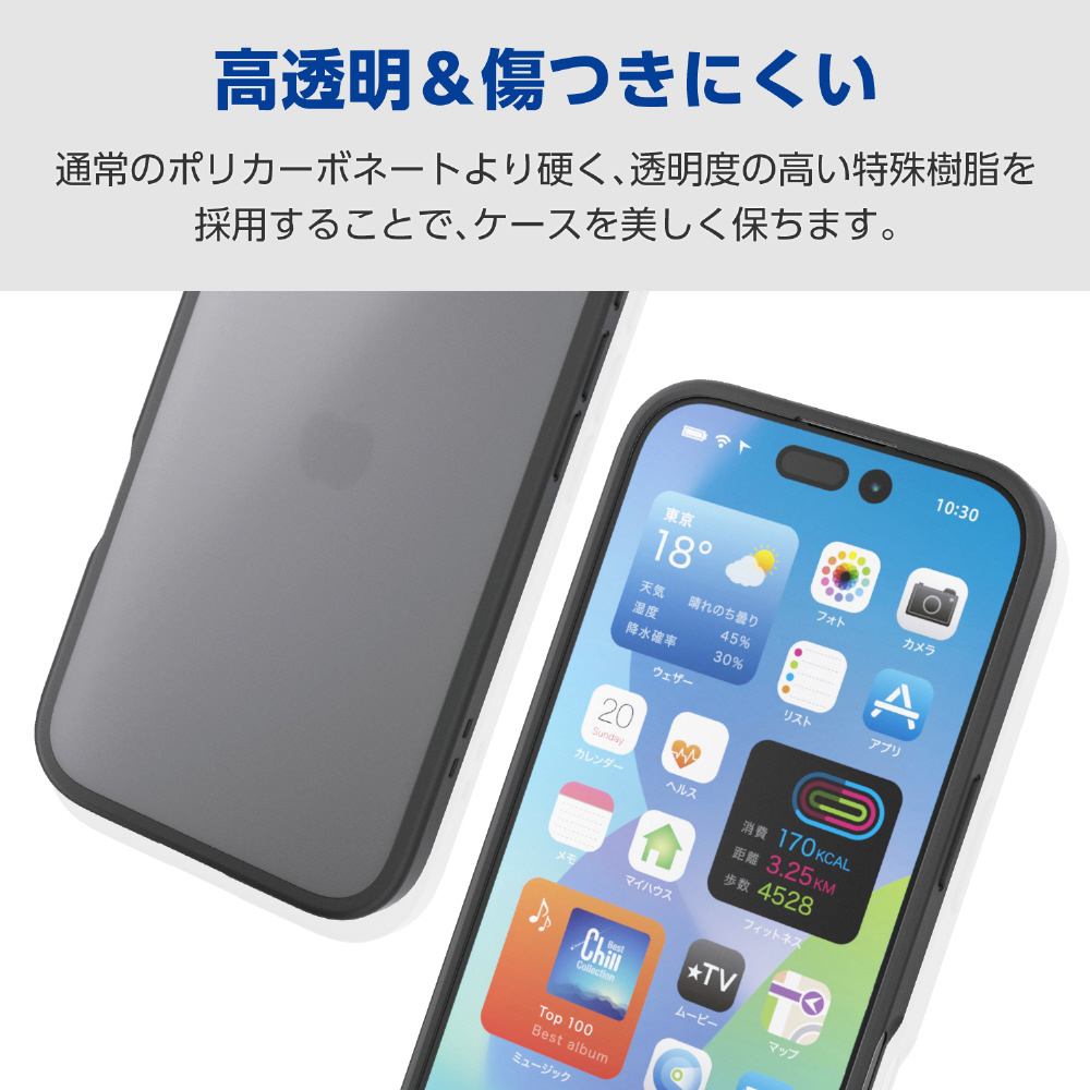 側面には弾力性のあるTPU(熱可塑性ポリウレタン)素材を、背面には強じんで透明度の高いポリカーボネート素材を使用した、スリムなスタイルのハイブリッドケースです。