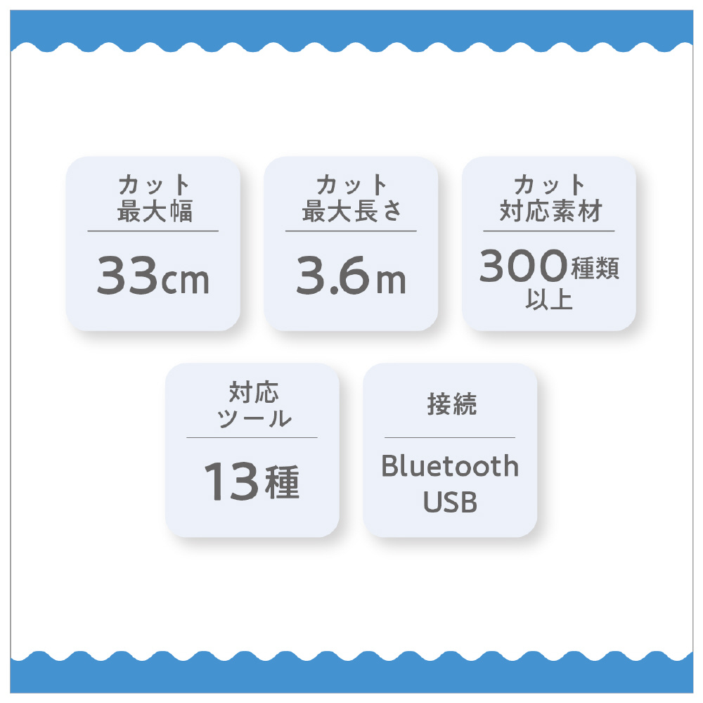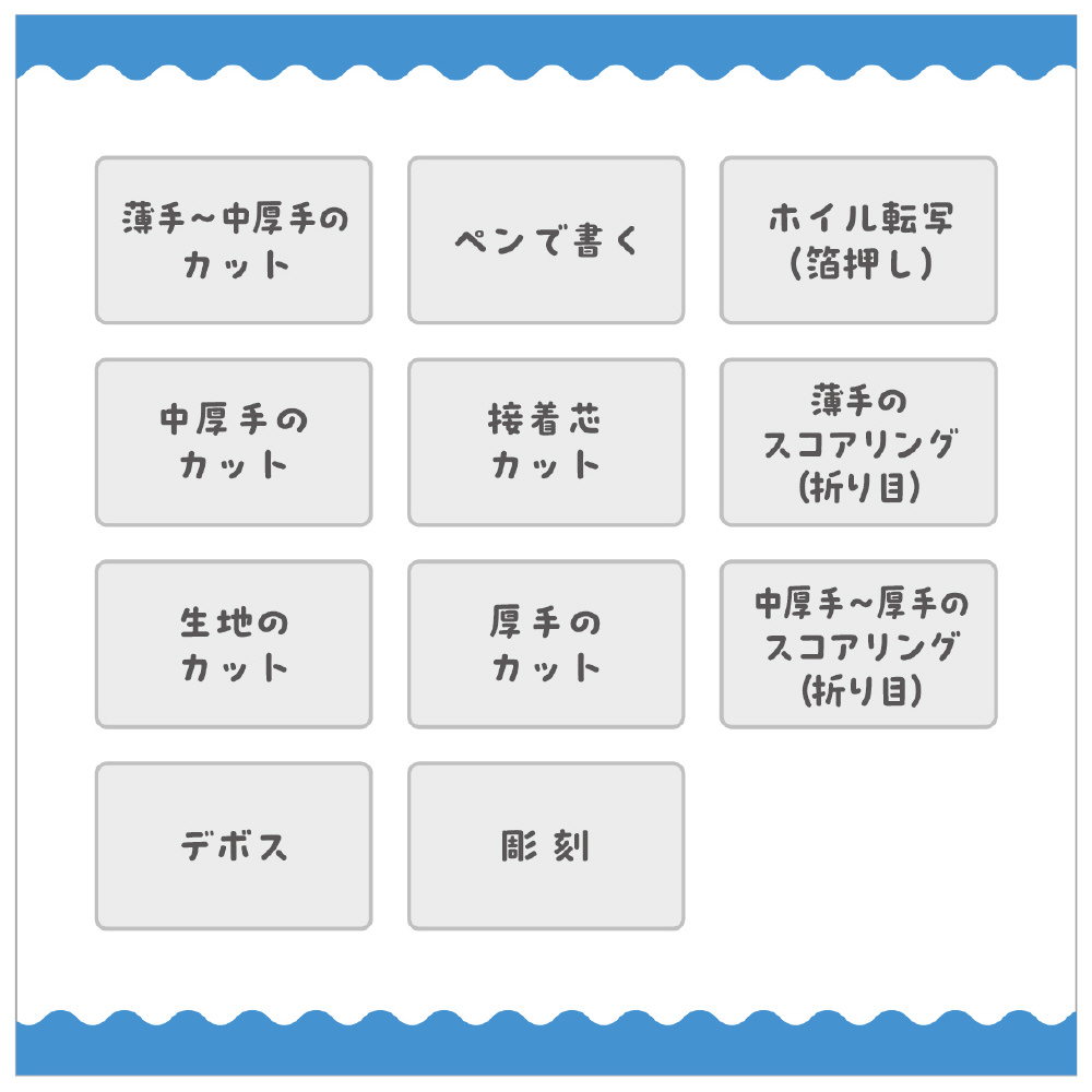 ●13種類のツールに対応し、カット、書き込む、スコアリング(折れ線)、箔押しなどの装飾が可能。