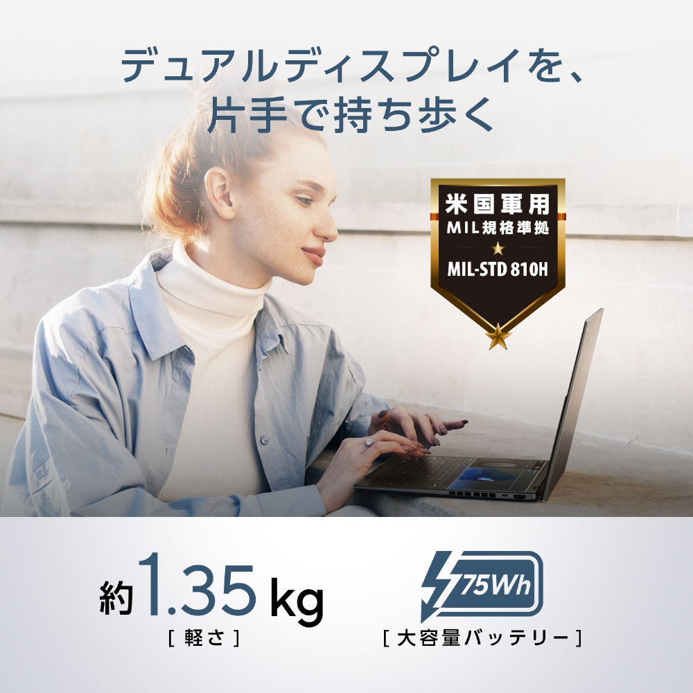 ASUS Zenbook DUOは、2つのフルサイズ有機ELタッチディスプレイ、取り外し可能なフルサイズキーボード、内蔵キックスタンドを備えた画期的なデュアルディスプレイ搭載ノートパソコンです。