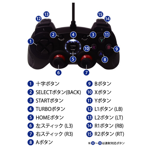 ・パソコンの仕様上、SELECT / L1 / L2 / R1 / R2の表記がBACK / LB / LT / RB / RTに変わります。