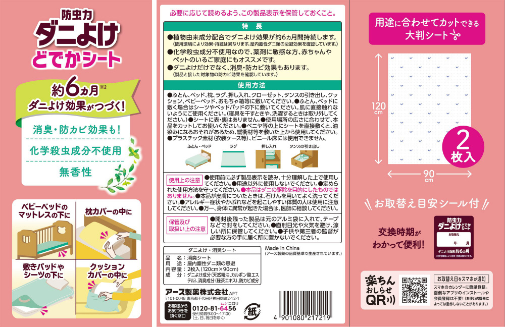 植物由来成分配合のダニよけシート。ダニよけ効果(※)が約6ヵ月間持続します。用途に合わせてカットできる大判シート2枚入。