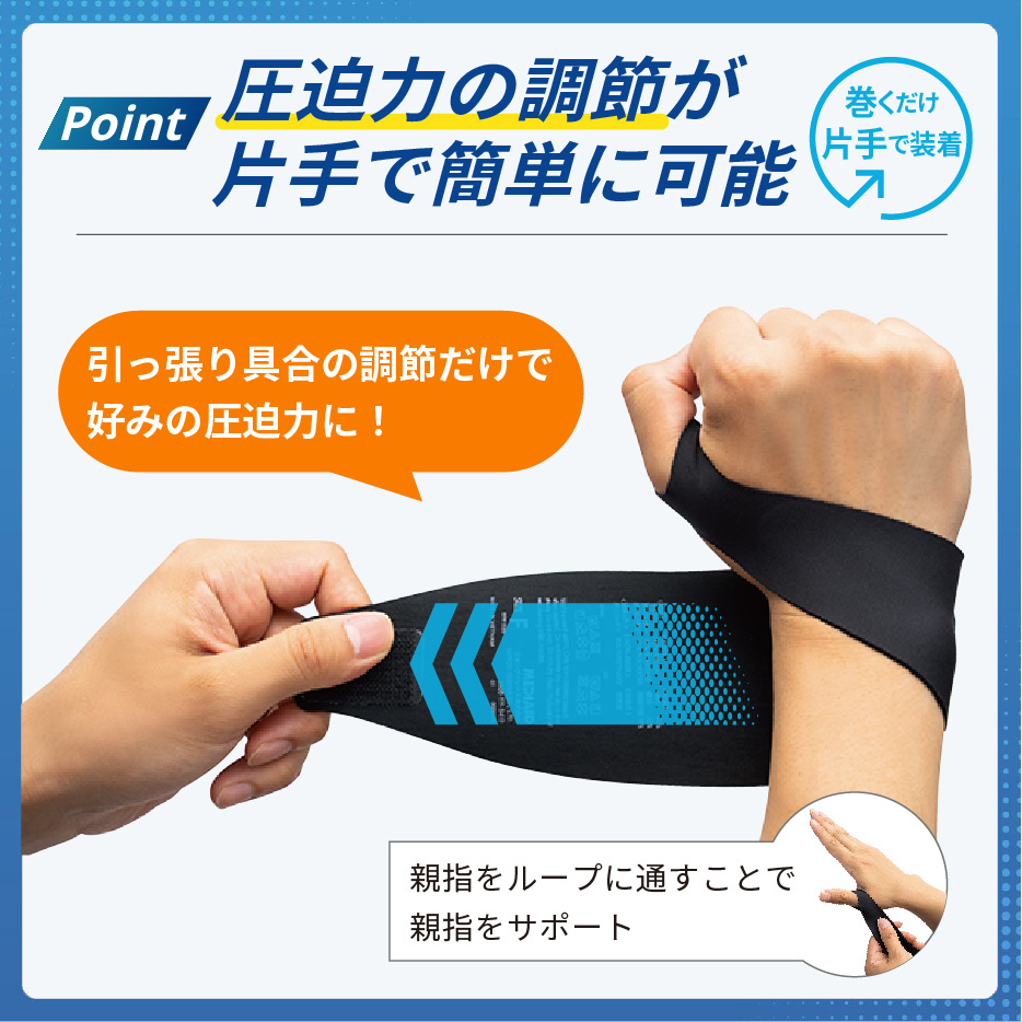 パワーフィルム構造と従来品よりも幅を広くしたベルトで「薄さと強さ」を両立。片手で簡単に圧迫力の調節が可能。指かけループが親指をサポート。