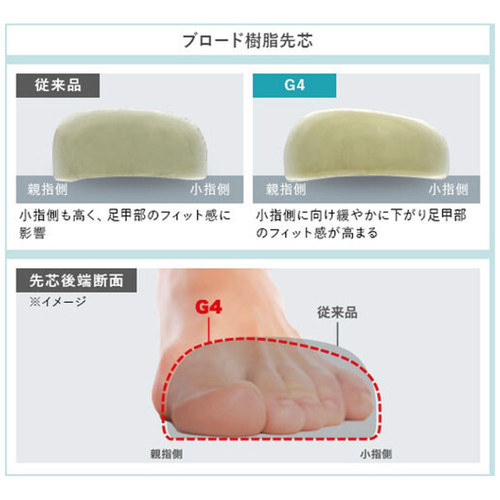 ■より足にフィットする形状にリニューアルしたブロード樹脂先芯を初めて搭載し、足の形状に合わせた形状が指先から甲部へのフィット感をより自然に合わせます。