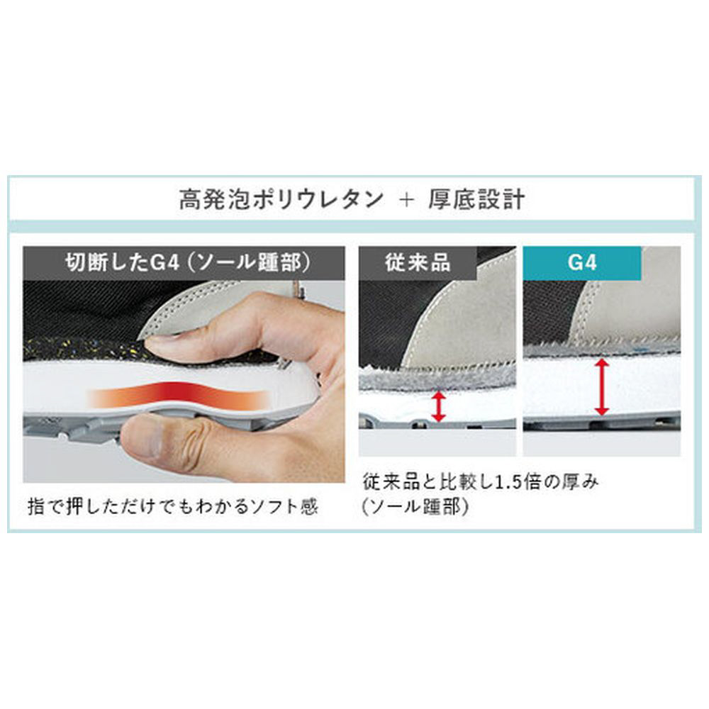 ■ミッドソールを高発泡にする事でソフト感を高め、さらに厚みを増やすことで、踵衝撃吸収性を損なわない、安全靴に最適なクッションソールを実現しました。