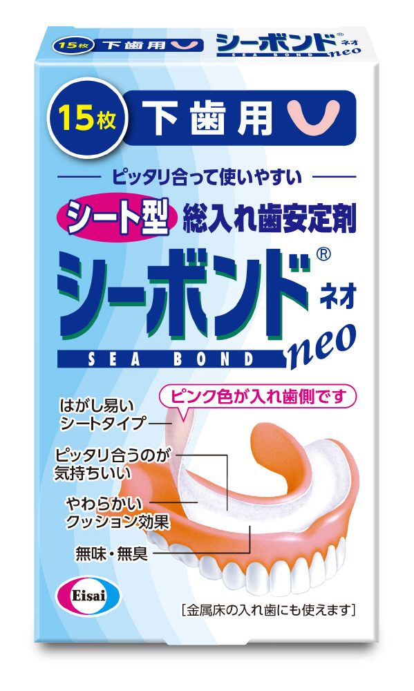 シーボンドネオ(販売名:シーボンド)は、海草由来のアルギン酸ナトリウムと複数の粘着成分を含むシートタイプの総入れ歯用の安定剤です