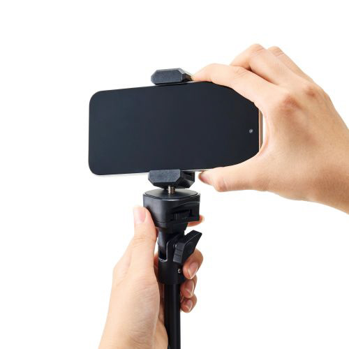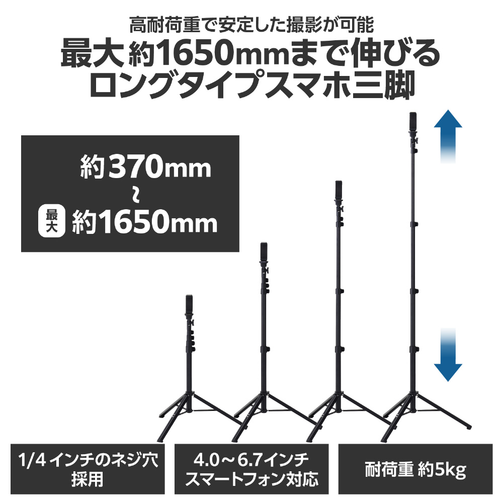 高耐荷重で安定した撮影が可能!最大約1650mmまで伸びるロングタイプのスマホ三脚です。高い位置まで調節できるので、全身撮影などに便利です。一眼レフカメラなど重い機器も安心して取り付けが可能。1/4インチネジを採用し、さまざまなアクセサリーが使用できます。 ※耐荷重:約5kg