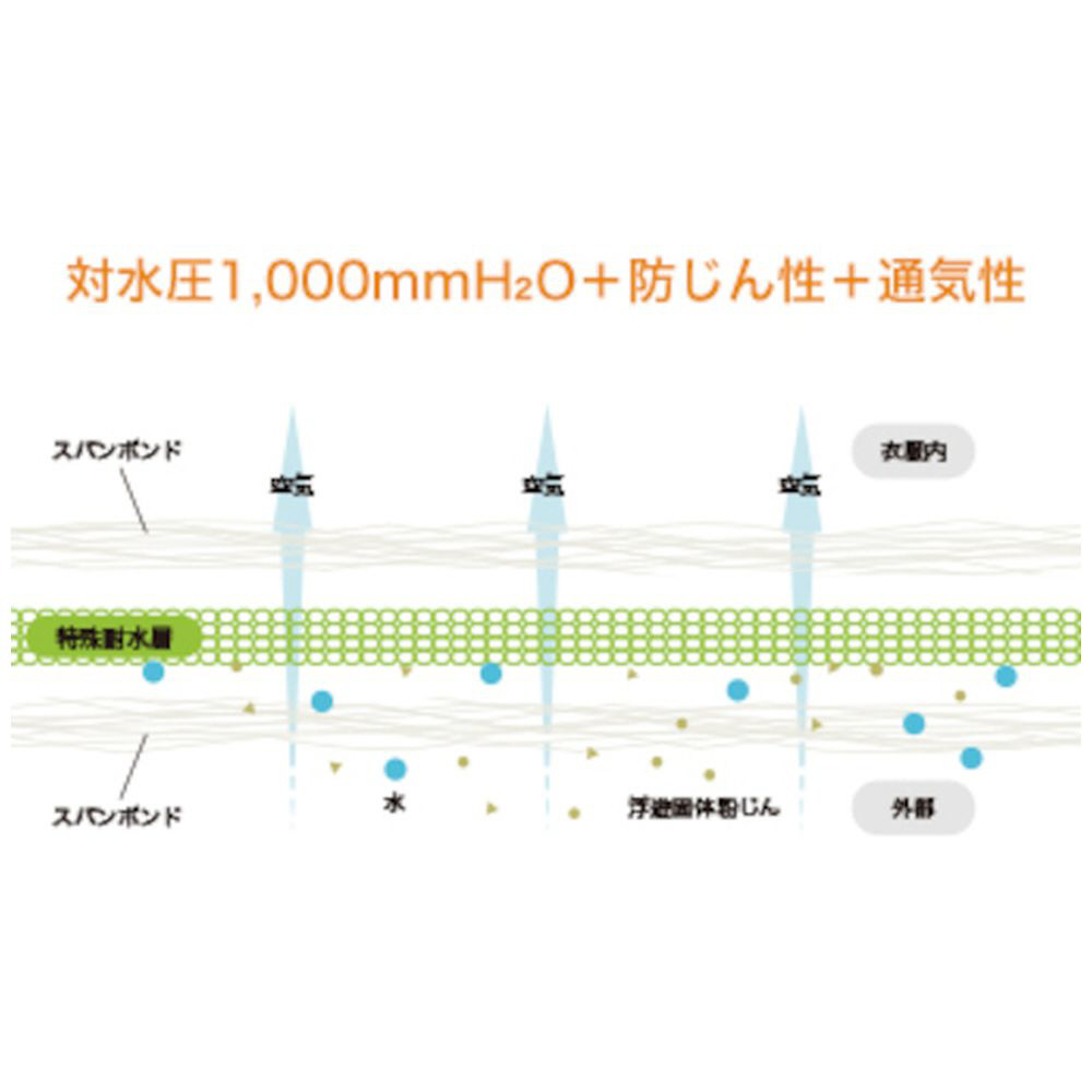 WBGT着衣補正値0℃素材使用、適度な通気性と耐水圧を両立しました。