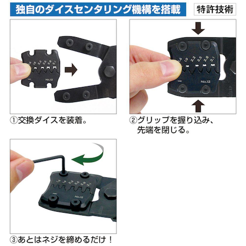 3種のダイス交換で300種以上の端子に対応しています。
