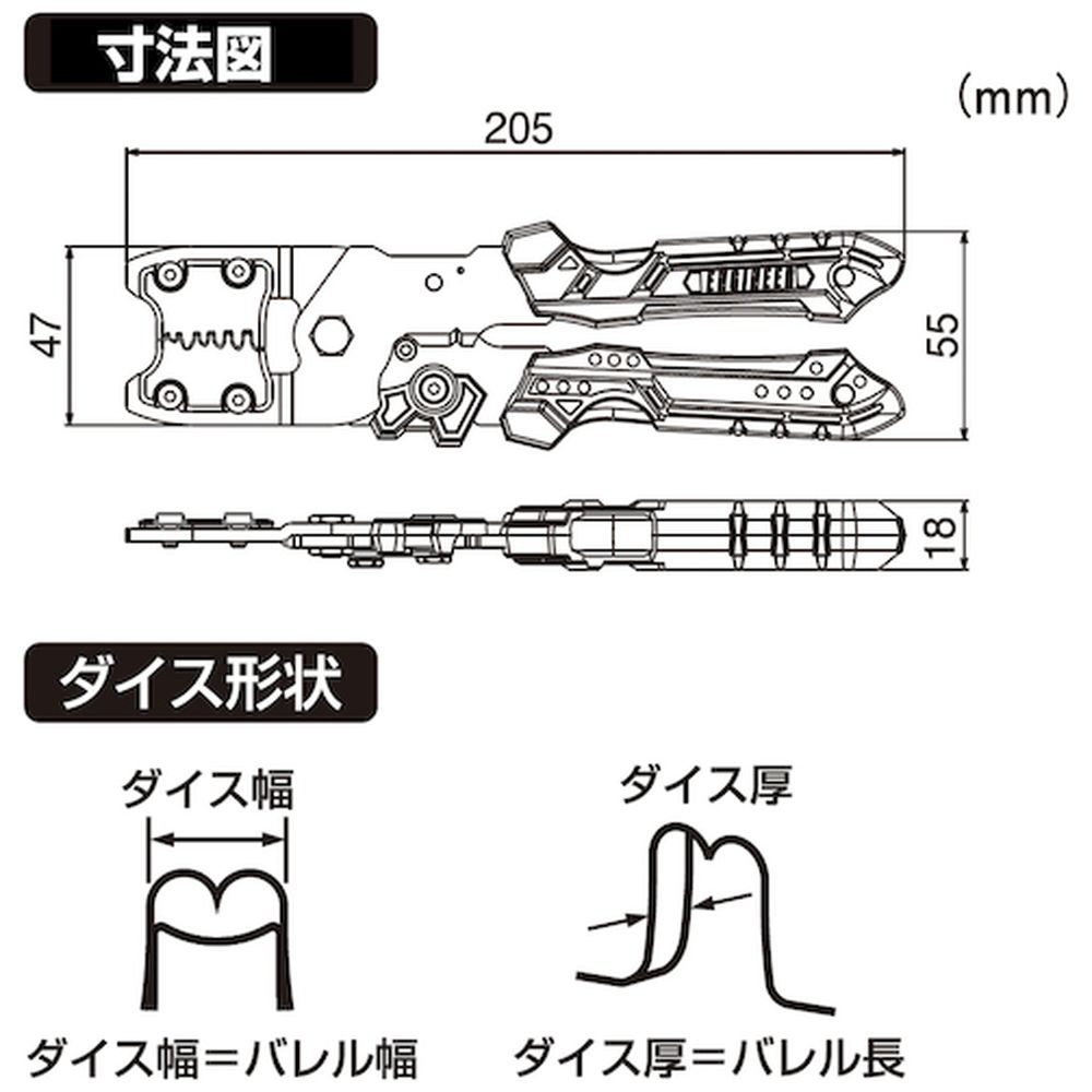 ■3種のダイス交換で300種以上の端子に対応しています。