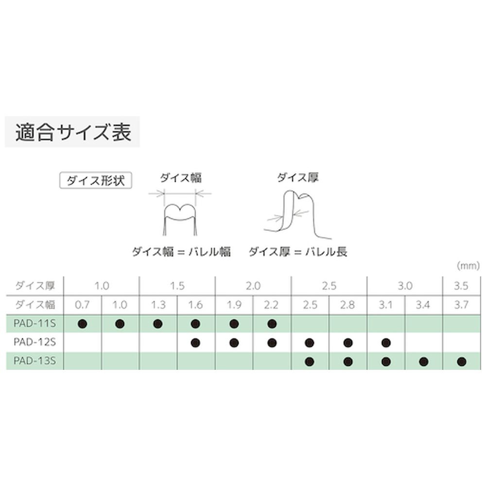 ・適合ダイス幅(mm): 0.7、1.0、1.3、1.6、1.9、2.2