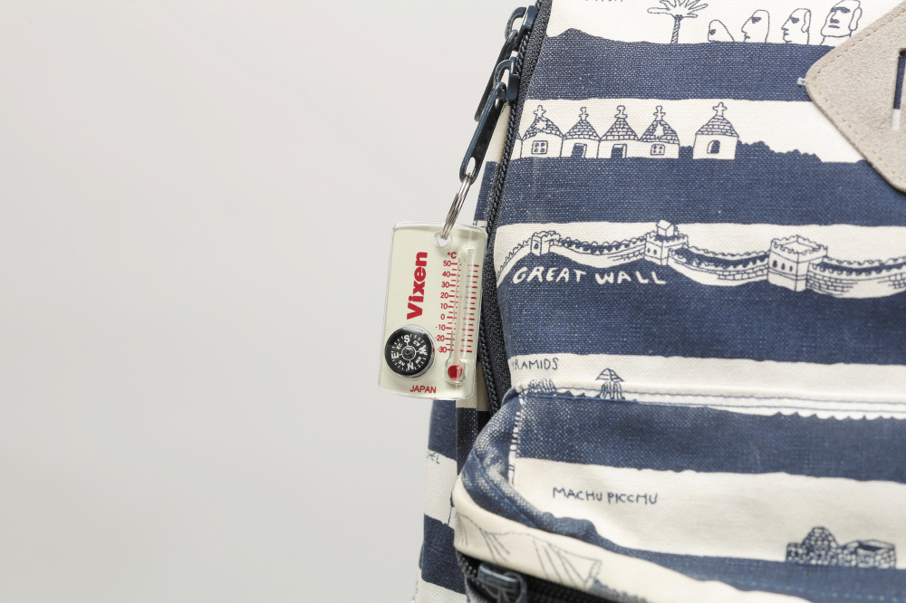 オイル式超小型コンパスと温度計が一緒になったジッパーコンパスです。バッグやジャケットのジッパープルとして、また車や家の鍵に付けてお使いいただけます。