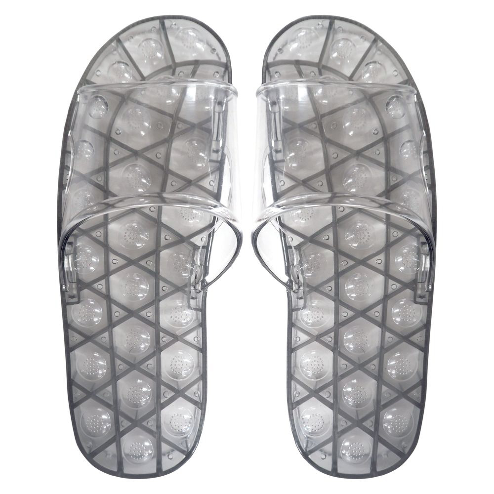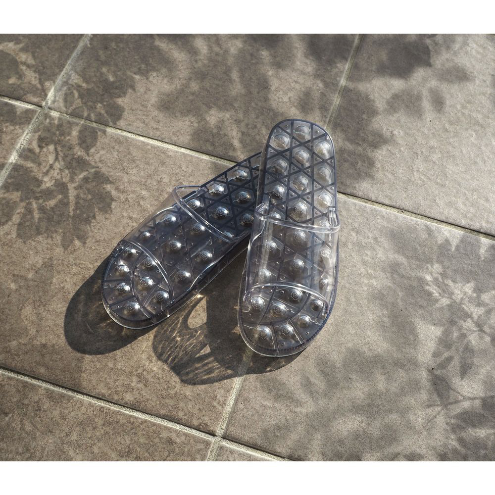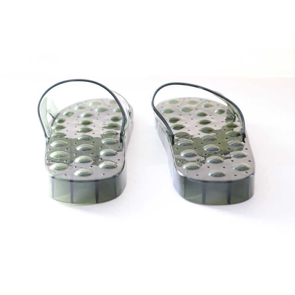 水はけがよい設計なのでいつでも快適。ベランダ履きやお風呂掃除、海水浴などマルチに活躍します。ソールの凹凸構造が足裏を刺激しクセになる踏み心地。簡単足裏マッサージ。ボタニカルな雰囲気をイメージした、大人おしゃれなカラーが魅力的なサンダル。透け感のあるクリアな素材で足元から涼しげに。【仕様】目安サイズ:約22.5〜25cm