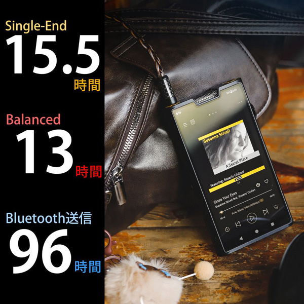 | バッテリー駆動時間 | シングルエンド:15.5時間、バランス:13時間、Bluetooth送信:96時間※端末の動作状況やソースにより変動します。 |
