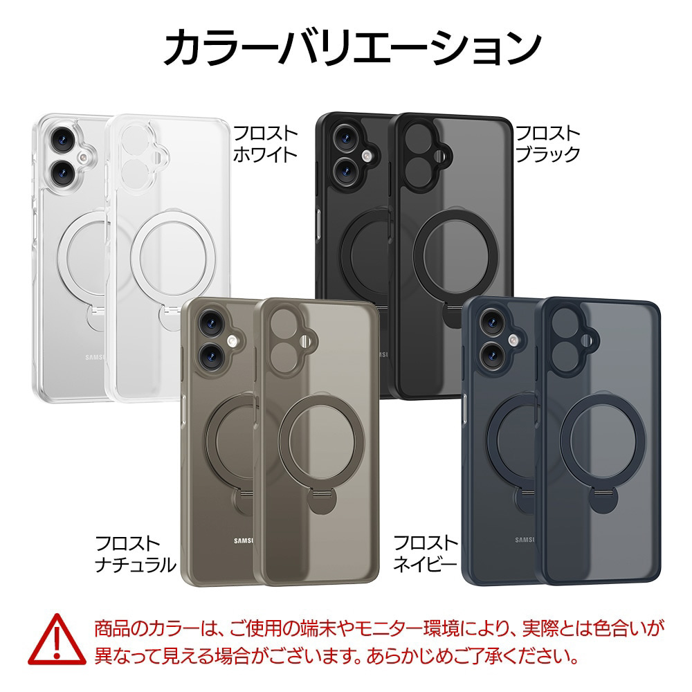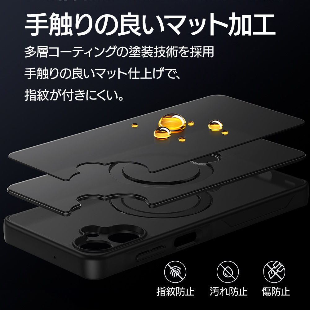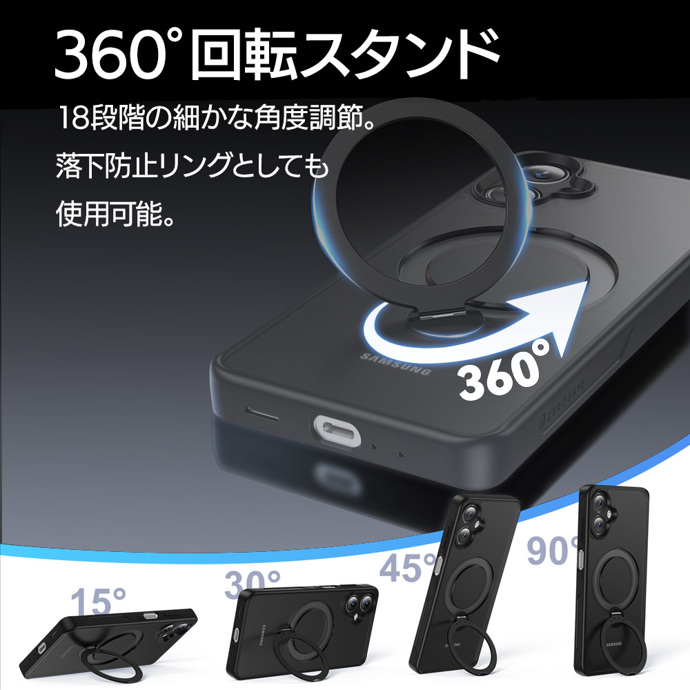 ●指が通せて操作安心、120度開閉&360度回転でお好みの角度に調整可能な、リング付き。使用しない時はスリムに収まります。※背面のリングを使用する際は必ず端末とケースを一緒に手に持ってください。リングのみを持って宙づりにしたり、振り回す等の行為はしないでください。端末の落下や本製品の破損の原因となります。