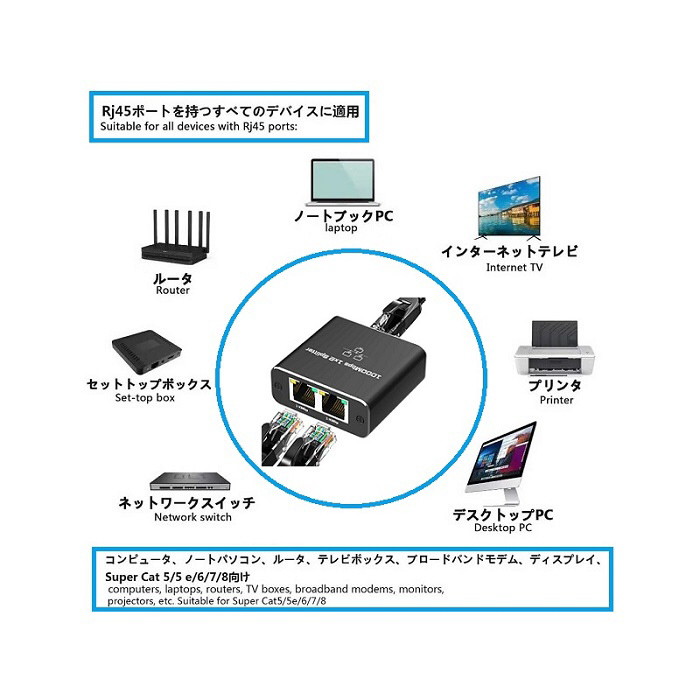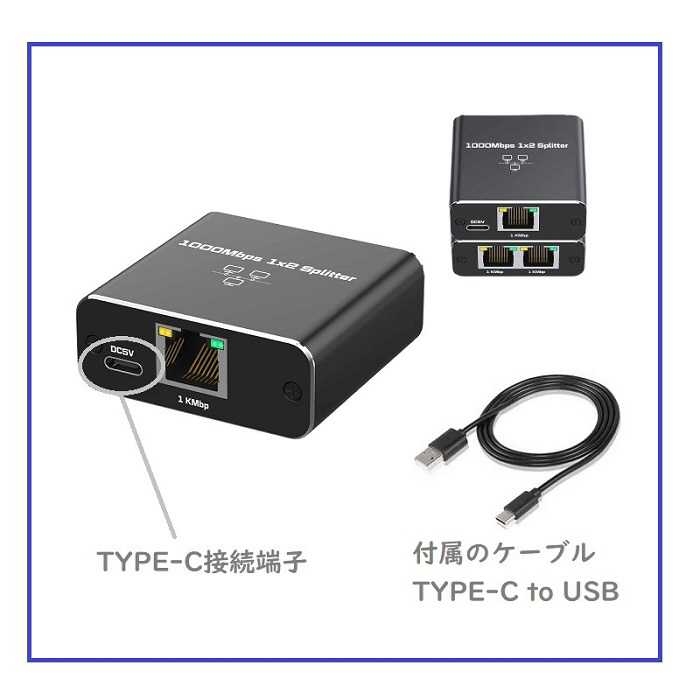 ネットワークスプリッター・アダプター(RJ45/LAN) 給電:USB(TYPE-C、DC5V)