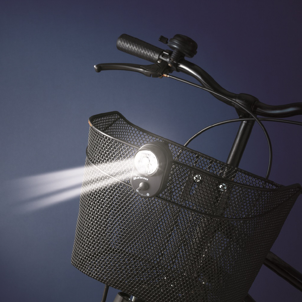 カゴや荷物に邪魔されずに照射発光するサイクルライトです。