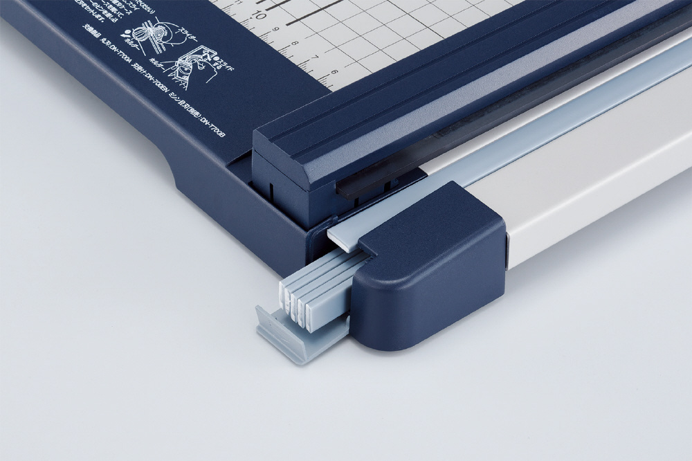 ●スライダーを前後にスライドするだけで、簡単に裁断ができるロータリー式ペーパーカッター(裁断能力:PPC用紙10枚)