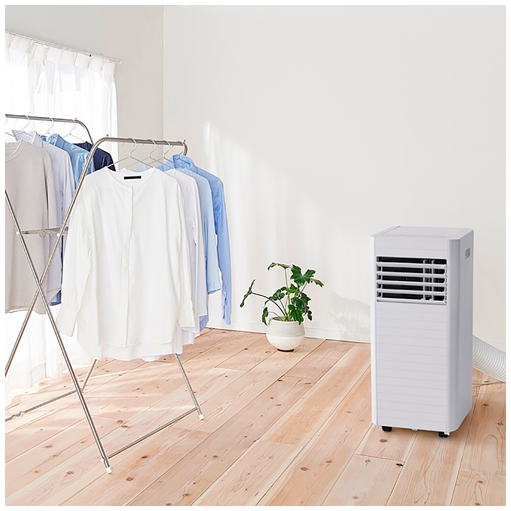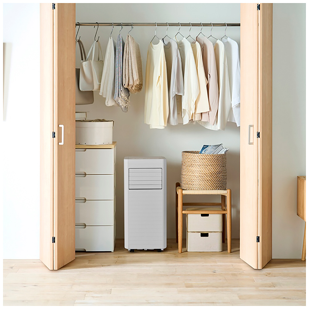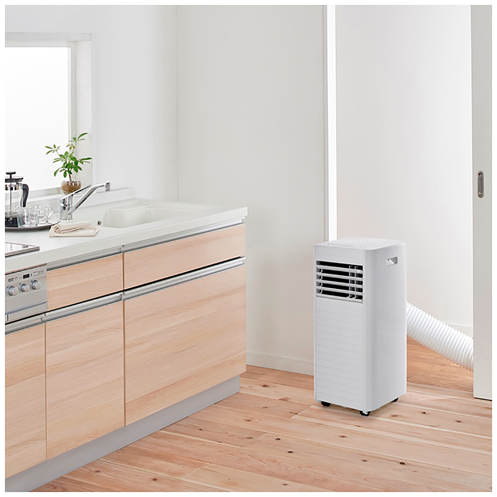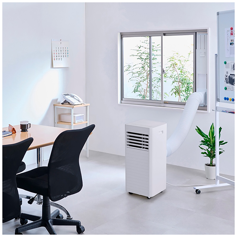 取付工事が不要で、エアコン配管穴が無く設置が難しい場所(キッチンやガレージなど)に、誰でも簡単に設置できる移動式エアコンです。