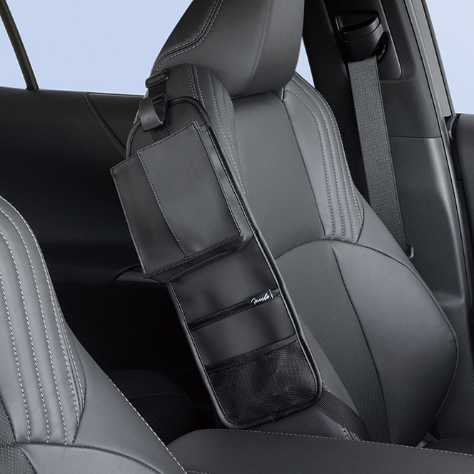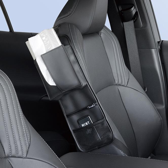 スマートフォンやソフトパックティッシュが入る多機能ポケット+小物ポケット×2付きです