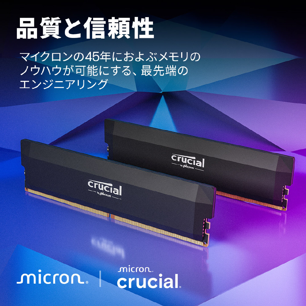 驚異的な速度と広い帯域幅を備えたCrucial DDR5 Pro OCゲーミングメモリで、パフォーマンスを次のレベルへ。低レイテンシーのパワーとスピーディーな動作は、パフォーマンスのボトルネックを心配することなく次の勝利をものにする原動力になります。