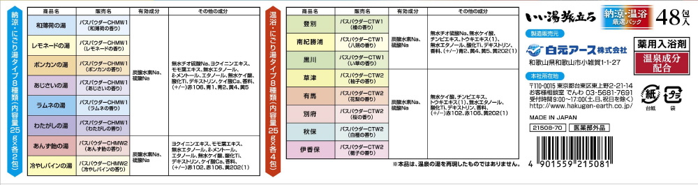 ●成分:≪和薄荷の香り、レモネードの香り、ポンカンの香り、あじさいの香り、ラムネの香り、わたがしの香り≫炭酸水素Na*、硫酸Na*、無水チオ硫酸Na、ヨクイニンエキス、モモ葉エキス、無水エタノール、l-メントール、エタノール、無水ケイ酸、酸化Ti、デキストリン、ケイ酸Ca、香料、(+/-)赤106、青1、青2、黄4、黄5≪あんず飴の香り、冷やしパインの香り≫炭酸水素Na*、硫酸Na*、ヨクイニンエキス、モモ葉エキス、無水エタノール、l-メントール、エタノール、無水ケイ酸、酸化Ti、デキストリン、ケイ酸Ca、香料、(+/-)赤102、赤106、黄202(1)≪檜の香り、八朔の香り、い草の香り≫炭酸水素Na*、硫酸Na*、無水チオ硫酸Na、無水ケイ酸、チンピエキス、トウキエキス(1)、無水エタノール、酸化Ti、デキストリン、香料、(+/-)青2、黄4、黄5、黄202(1)≪柚子の香り、花梨の香り、桜の香り、白檀の香り、梔子の香り≫炭酸水素Na*、硫酸Na*、無水ケイ酸、チンピエキス、トウキエキス(1)、無水エタノール、酸化Ti、デキストリン、香料、(+/-)赤102、赤106、黄202(1)※*は[有効成分]、無表示は[その他の成分]