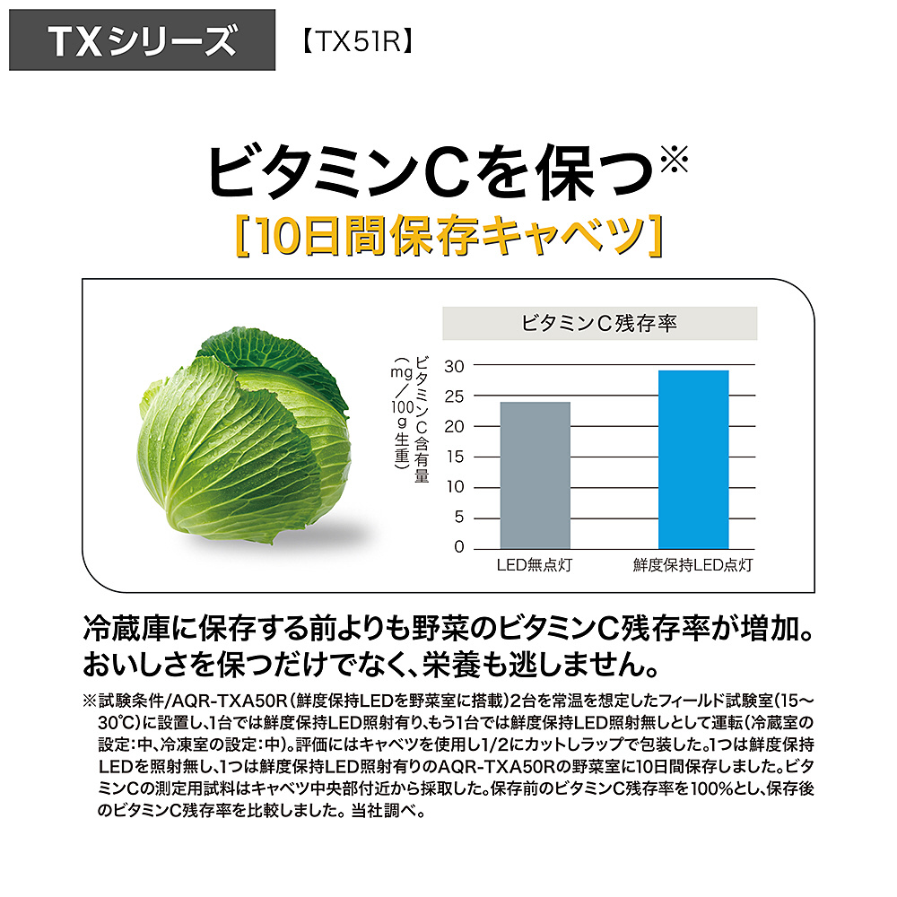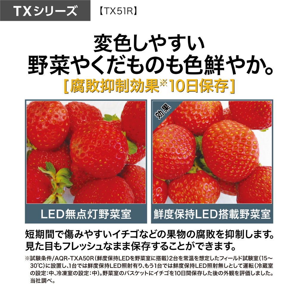 短期間で傷みやすいイチゴなどの果物の腐敗を抑制します。見た目もフレッシュなまま保存することができます。 ※試験条件/AQR-TXA50R(鮮度保持LEDを野菜室に搭載)2台を常温を想定したフィールド試験室(15〜30℃)に設置し、1台では鮮度保持LED照射有り、もう1台では鮮度保持LED照射無しとして運転(冷蔵室の設定:中、冷凍室の設定:中)、野菜室のバスケットにイチゴを10日間保存した後の外観を評価しました。