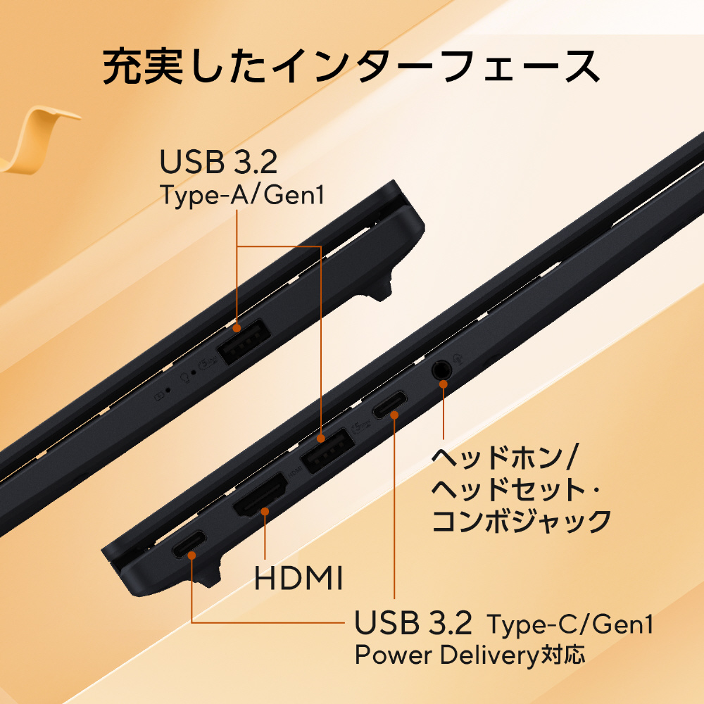 | インターフェイス | ディスプレイ出力:HDMI×1、Type-C×2 USBポート:USB3.2 (Type-C/Gen1/Power Delivery対応) ※×2、USB3.2 (Type-A/Gen1) ×2 ※データ転送と映像出力、本機への給電をサポートしています。すべてのデバイスの動作を保証するものではありません。 |