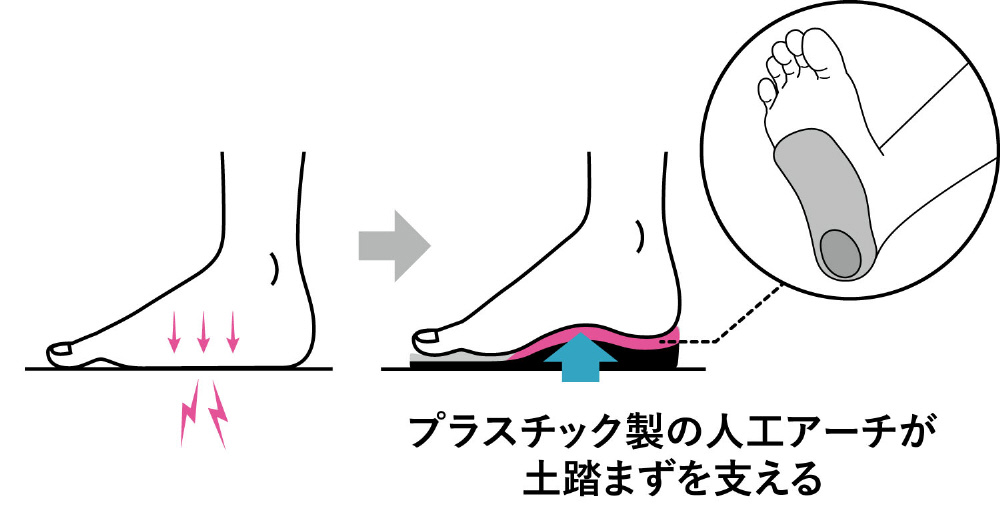 AKAISHIインソールの人工アーチは、体重がかかってもつぶれること無く土踏まずを支えることができます。