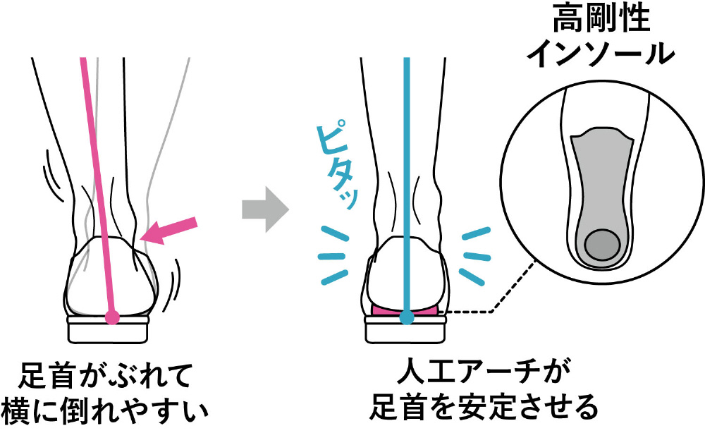 左右のぶれをアーチがふせぎ、また、ヒールカップがかかとを安定させます。