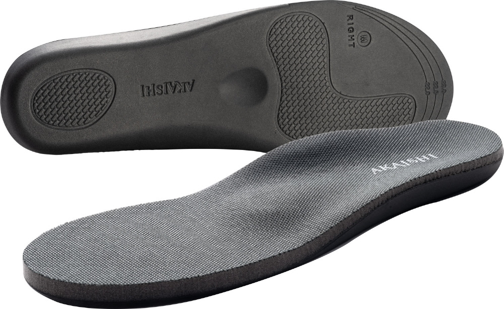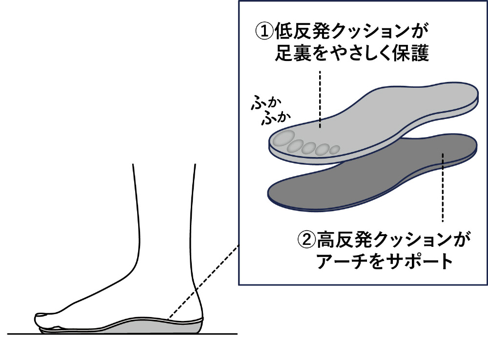 AKAISHIインソールは、2種類の硬さのクッションを組み合わせることで、足裏に必要なクッション機能をサポートします。