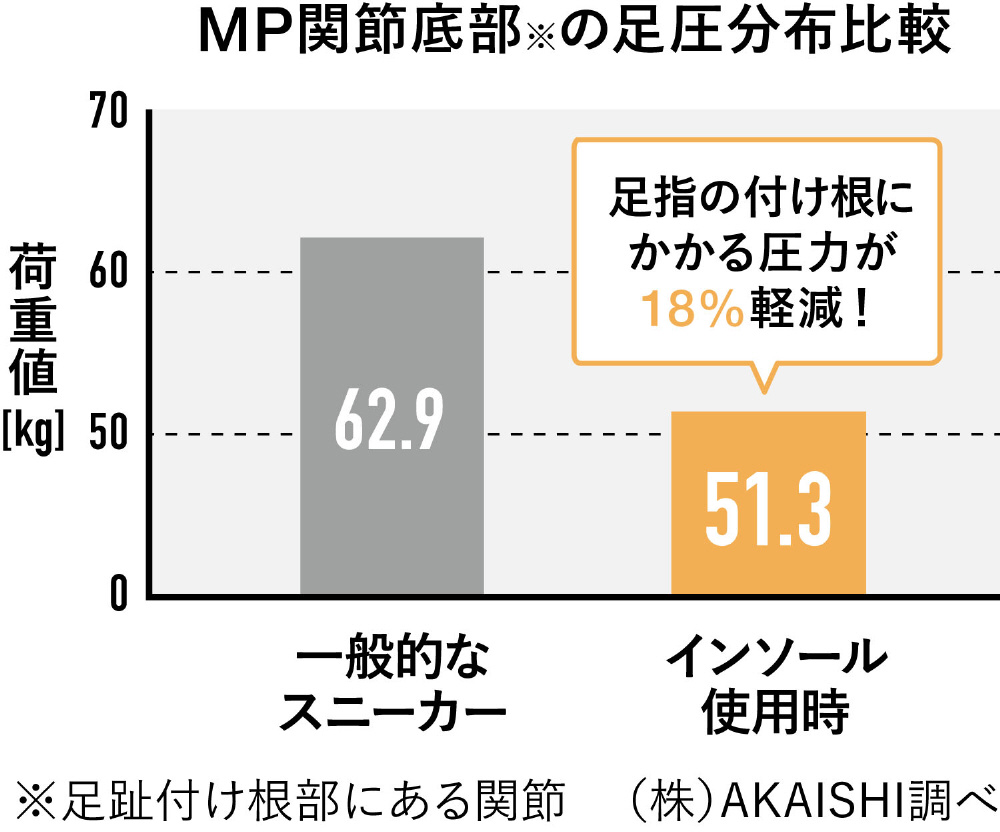 AKAISHIインソールの低反発クッションは、厚さ8mmで集中する圧迫を分散します。