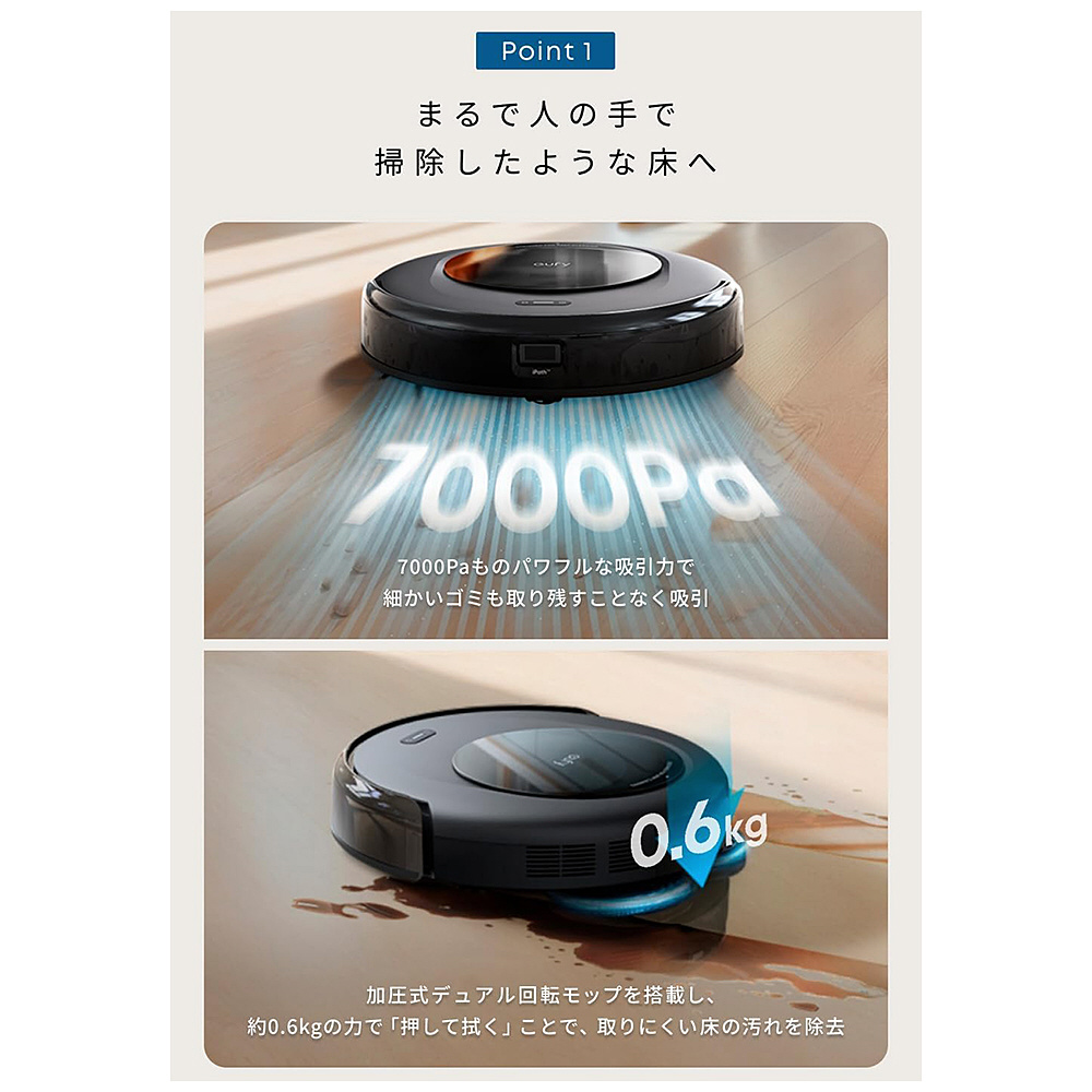 7000Paの強力な吸引力に加えて、加圧式デュアル回転モップを搭載。約0.6kgの圧力で「押して拭く」ことが可能なため、まるで人の手で水拭きしたような掃除を実現します。