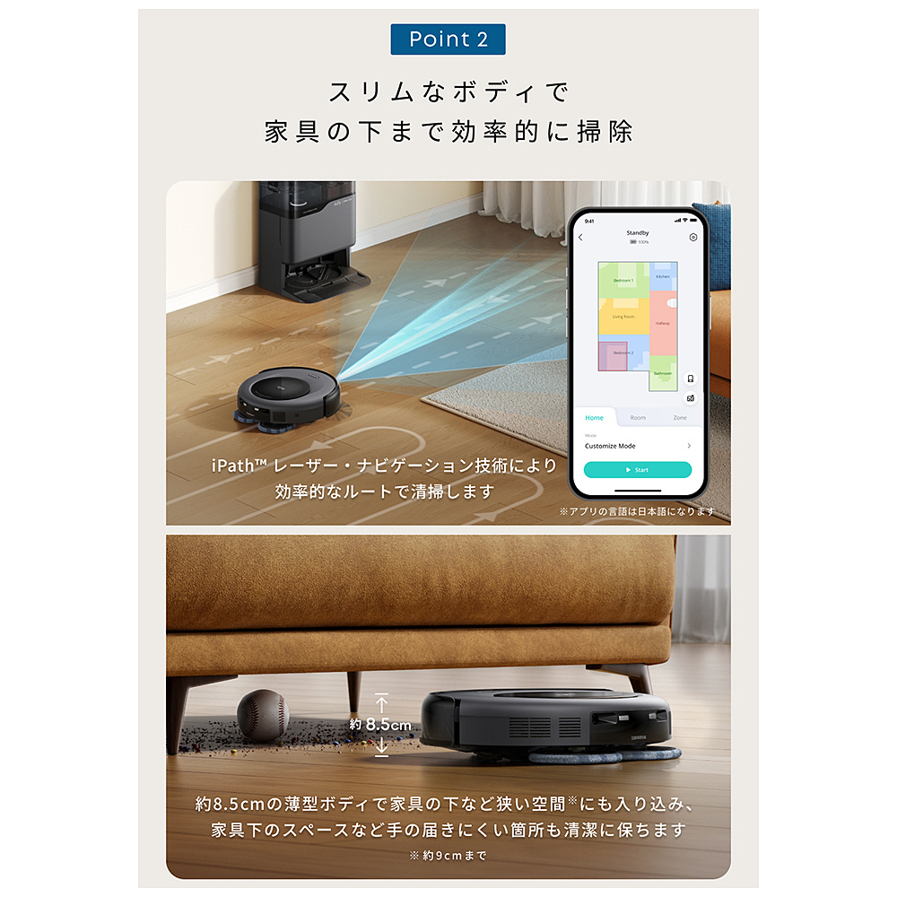 約8.5cmの薄型のボディで、ソファやベッドなど家具下の狭い空間にも入り込み、手の届きにくいところも隈なく清掃します。