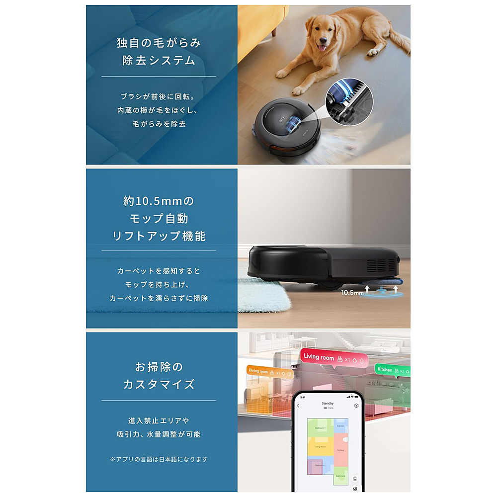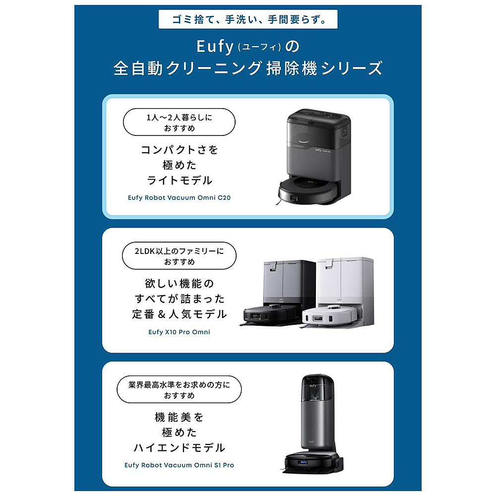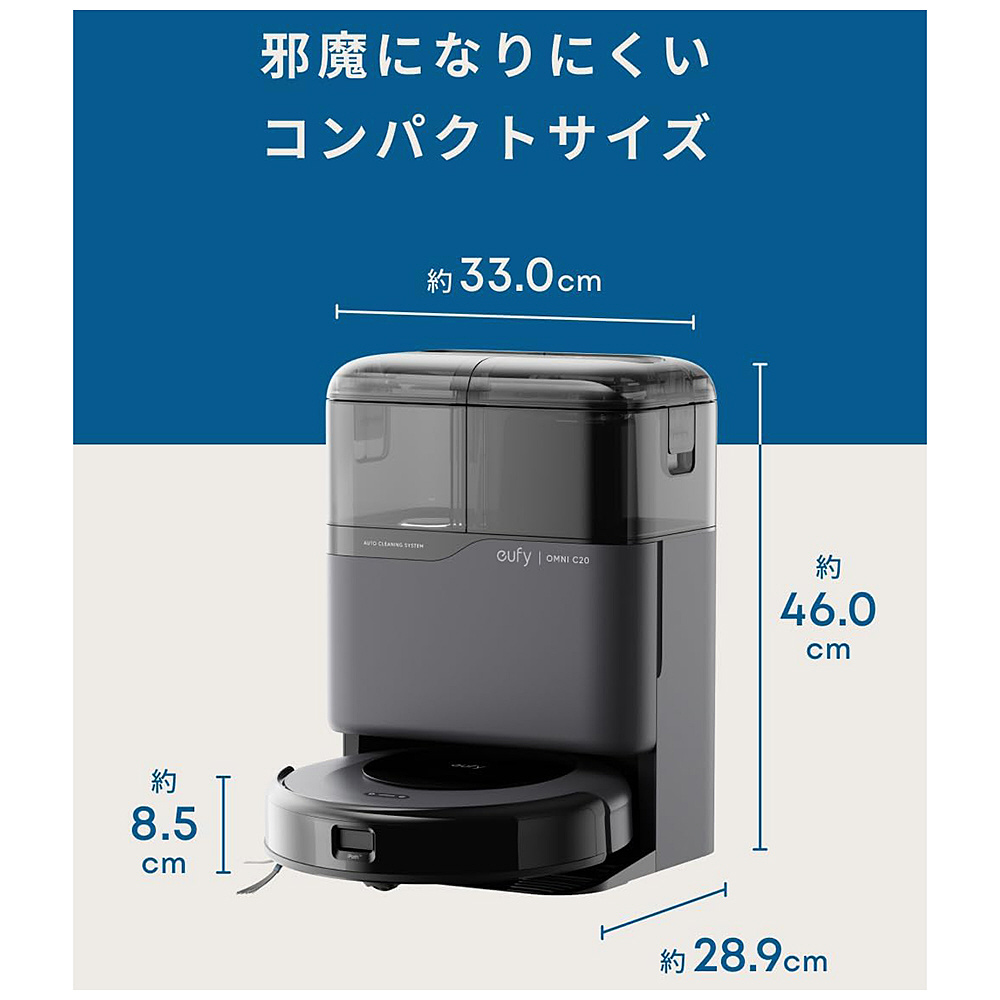コンパクトな全自動クリーニングステーション付属で、ゴミ収集からモップ洗浄・乾燥まで任せられる、欲しい機能をすべて備えたEufy全自動クリーニング掃除機シリーズのライトモデル。